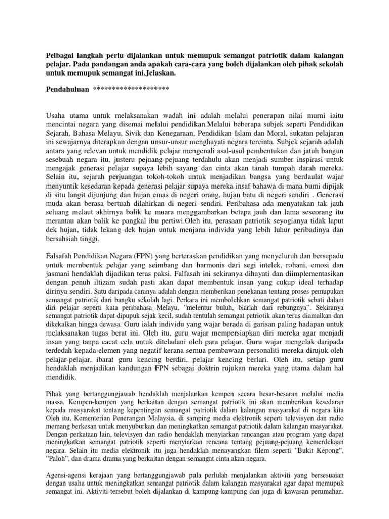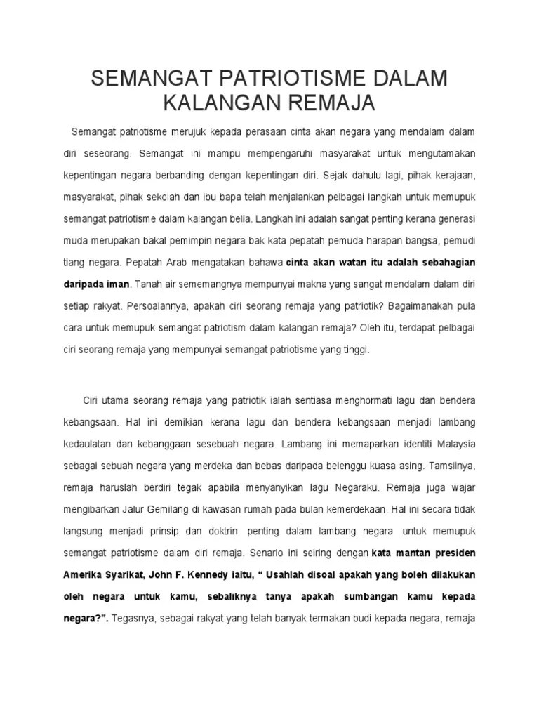 Doc Karangan Semangat Patriotisme Dazzling Indulgence Academia Edu from 0.academia-photos.com Dapat memupuk semangat perpaduan yang merupakan elemen yang penting di dalam semangat patriotik sesuai dengan pepatah iaitu "bersatu kita teguh, bercerai kita roboh". Antara acara yang boleh dijalankan termasuk nyanyian lagu patriotik,tayangan filem berkaitan semangat patriotik dan sebagainya. Hal ini demikian kerana dapat melahirkan warganegara yang cinta akan negara dan menjadi individu yang berguna kepada bangsa dan negara. Remaja kurang semangat patriotisme kerana tidak merasai kesusahan hidup semasa zaman penjajahan, contohnya orang yang hidup zaman penjajahan jepun di tanah melayu pasti teringat semasa mereka menghadapi kesusahan untuk mendapat bekalan makanan dan pakaian. See full list on ipendidikan.my Kita seharusnya berasa amat bersyukur dan merasakan diri amat bertuah kerana dapat hidup di negara yang aman dan damai. Jelaslah bahawa peranan kerajaan juga dapat memupuk semangat patriotisme pelbagai kaum di negara kita. Oleh itu, jabatan penerangan malaysia boleh menggunakan media elektronik seperti televisyen dan radio yang sememangnya berkesan untuk menyuburkan dan meningkatkan semangat patriotik dalam kalangan masyarakat.