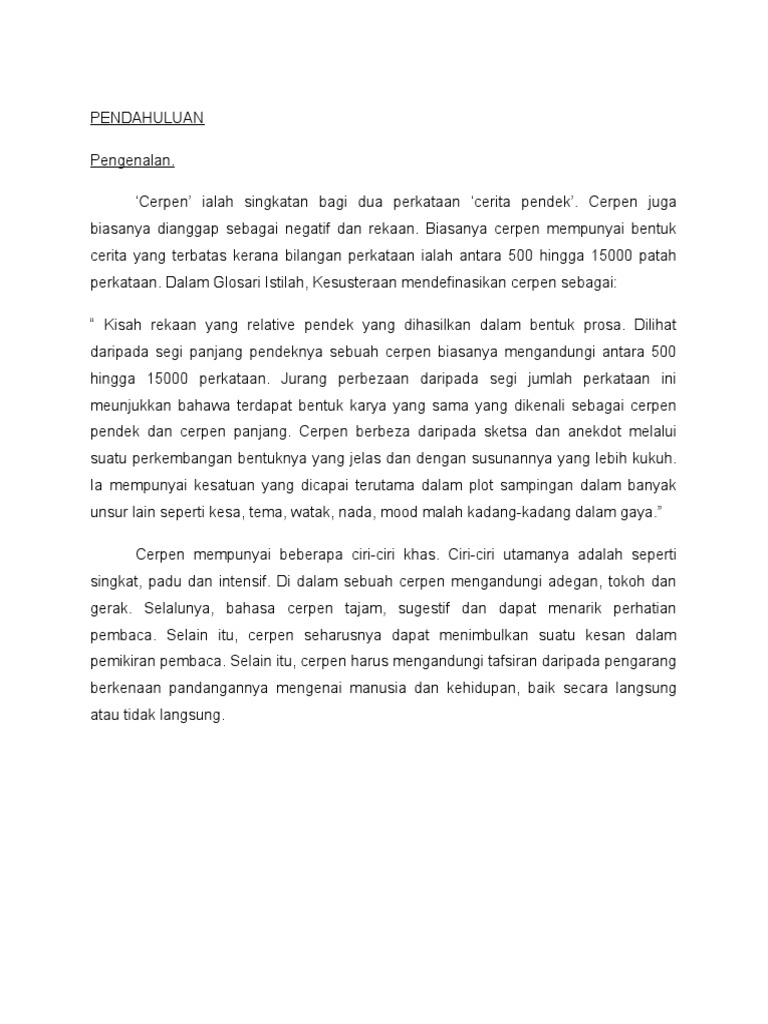 Di bangku sekolah menengah, materi tentang cerpen juga sudah diajarkan. Panjangnya cerpen ialah antara 5,000 hingga 20,000 patah perkataan. The ugly ducking lengkap dengan artinya. Azfaryll isaac bin azizan no. Terdapat lima genre/bidang dalam kesusasteraan melayu moden iaitu cerpen, drama, esei/kritik, novel dan puisi.